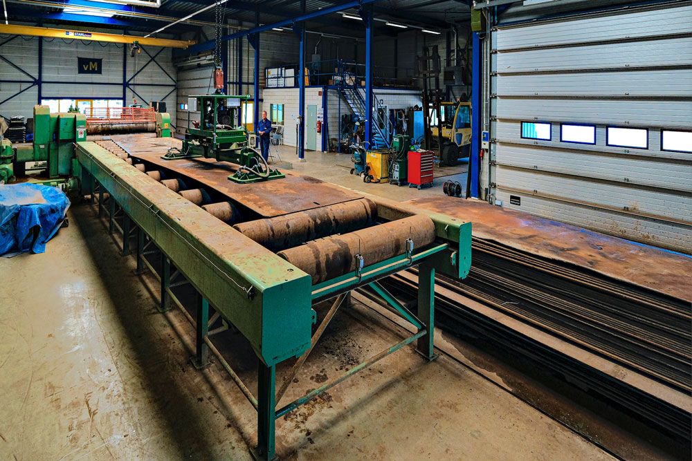 Die Stahlplatten sind unser Eigentum, also gehen wir sorgsam damit um. In unserem Walzwerk pflegen wir die Stahlplatten gut. Stahlplatten, die verbogen zurückkommen, richten wir mit unserer Blechrichtmaschine wieder gerade. So können wir stets schön ebene Platten liefern. Im Walzwerk werden Stahlplatten auch für Dritte gewartet.