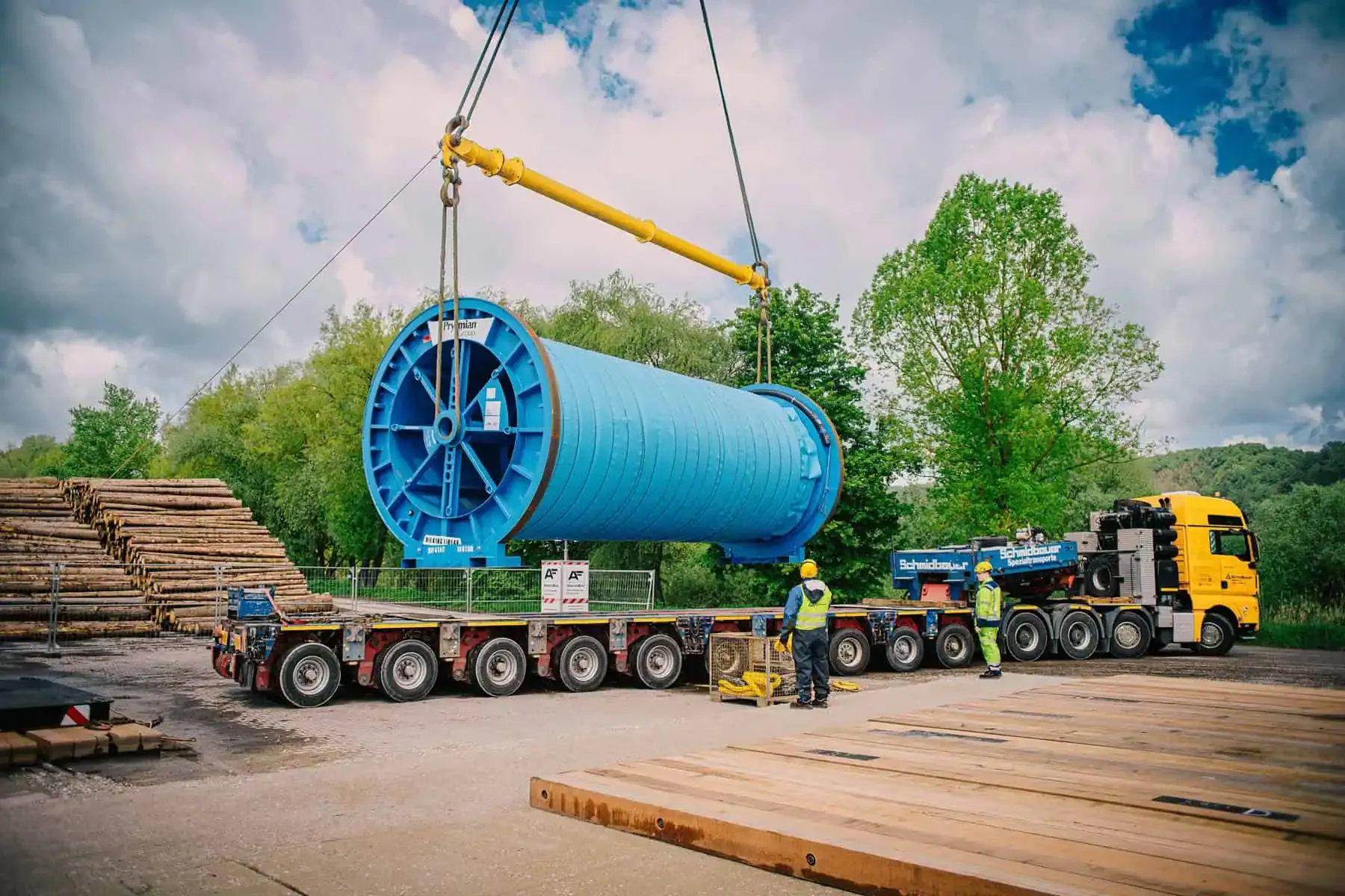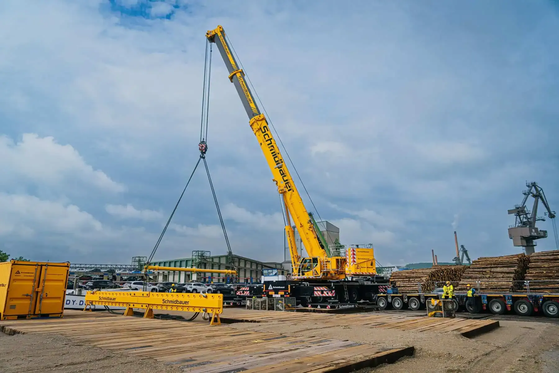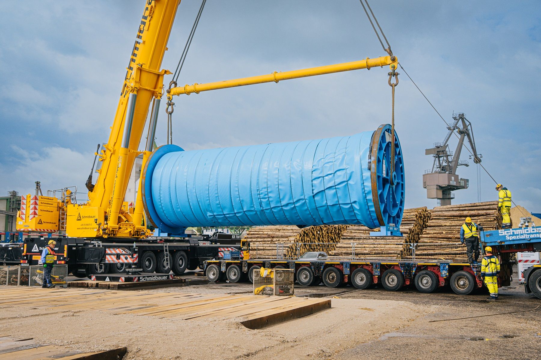 Schmidbauer speelt een essentiële rol in het SuedOstLink-project, een cruciaal onderdeel van de energietransitie in Duitsland. Het project omvat de logistieke coördinatie en opslag van 300 kilometer gelijkstroomkabels. De kabels worden over een 17-daagse reis van Gron naar Beieren vervoerd en opgeslagen op een 25.000 m² locatie in Regensburg. Met behulp van een Liebherr LR 1300.1 SX kraan voert Schmidbauer zware hijswerkzaamheden uit om de kabelhaspels, die tot 80 ton wegen, efficiënt te lossen en te plaatsen. Deze activiteiten ondersteunen de installatie van 1.000 kilometer aan kabels, een belangrijke stap voor het SuedOstLink-project.